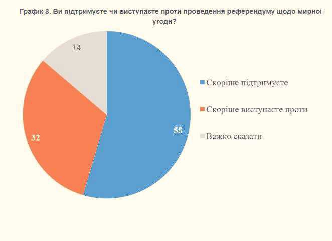 Большинство украинцев поддерживают идею вынесения мирного соглашения с Россией на референдум. По данным опроса КМИС, 55% респондентов выступают за такой формат, против — 32%