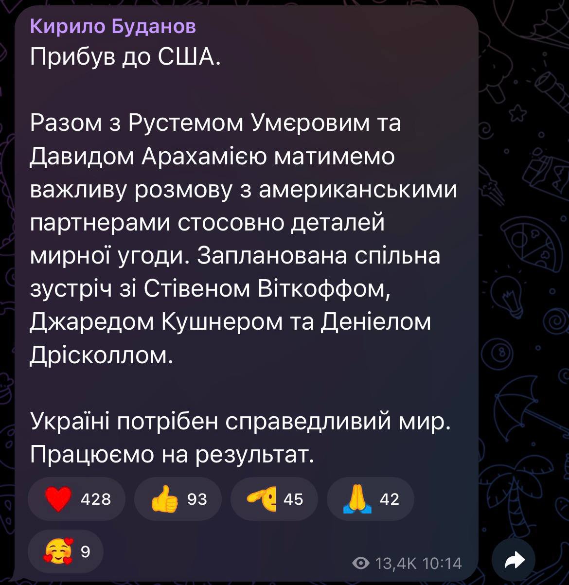 «Мы проведем важный разговор с американскими партнерами о деталях мирного соглашения. Запланирована совместная встреча со Стивеном Виткоффом, Джаредом Кушнером и Дэниелом Дрисколлом (министр армии США, считается близким к Вэнсу). Украине нужен справедливый мир. Мы работаем над достижением результата», - написал Буданов.