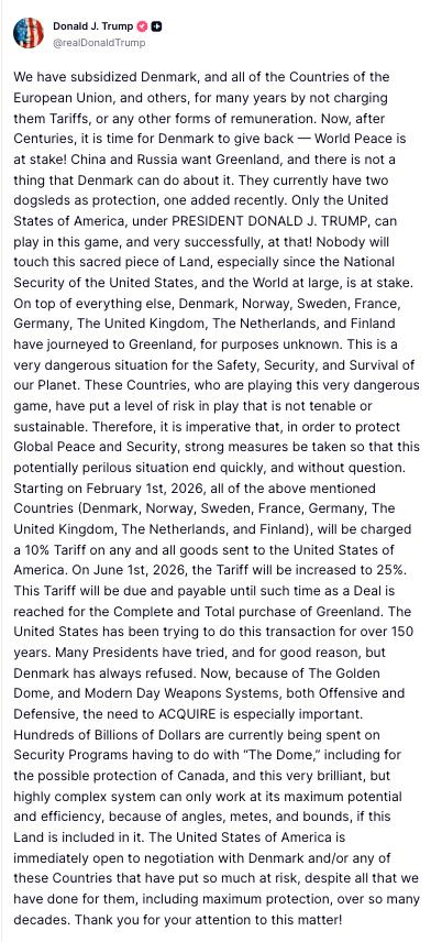 Также Трамп заявил, что США с 1 февраля повысят пошлины против Дании, Норвегии, Швеции, Франции, Германии, Великобритании, Нидерландов и Финляндии до 10% а с 1 июня — до 25%, из-за их позиции по Гренландии