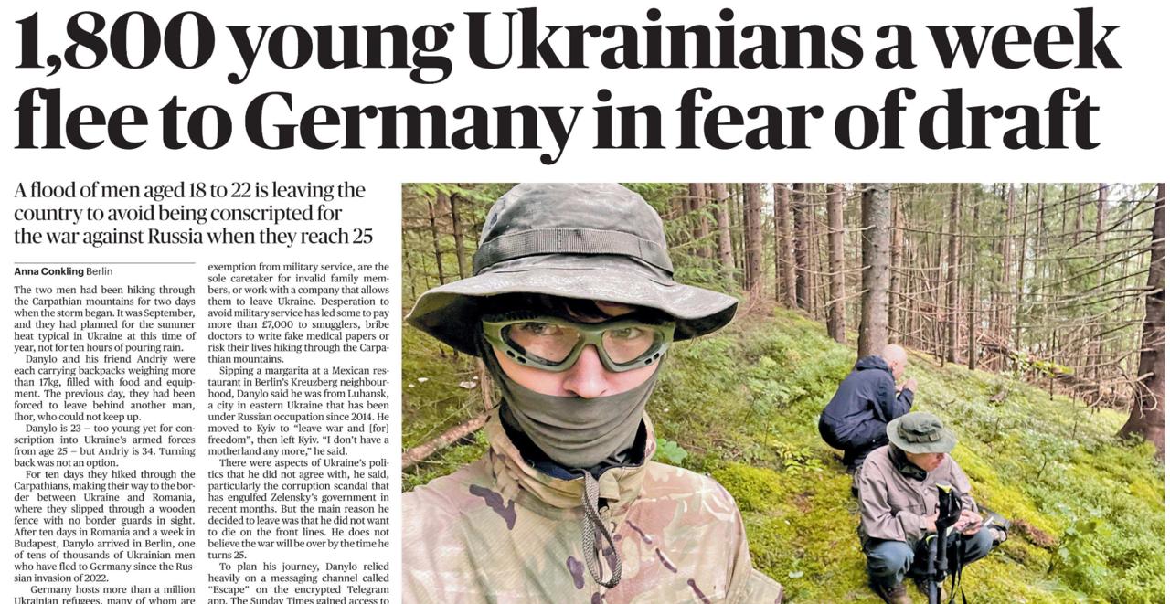 «1800 молодых украинцев каждую неделю убегают в Германию, боясь призыва». Сегодняшняя The Sunday Times напоминает, что до прошлогоднего разрешения покидать страну 18-22-летним парням это число в среднем составляло 19 человек в неделю.