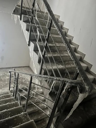 Кроме того, в одном из домов в украинской столице полностью обледенела лестница — сосульки свисают прямо с поручней. Жители отмечают, что базовые человеческие потребности им теперь недоступны, так как температура в квартирах опускается ниже нуля, а света нет на протяжении нескольких дней.