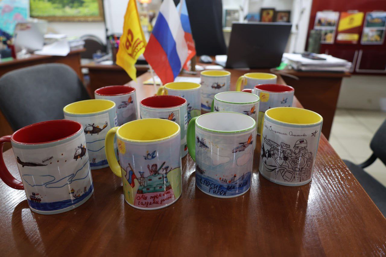 Особенно хочется отметить доставленные из Санкт-Петербурга от писателя Дениса Сорокина сувенирные чашки для военнослужащих. Ценность этого подарка заключается в том, что на кружках размещены детские рисунки с добрыми, позитивными надписями для наших защитников.