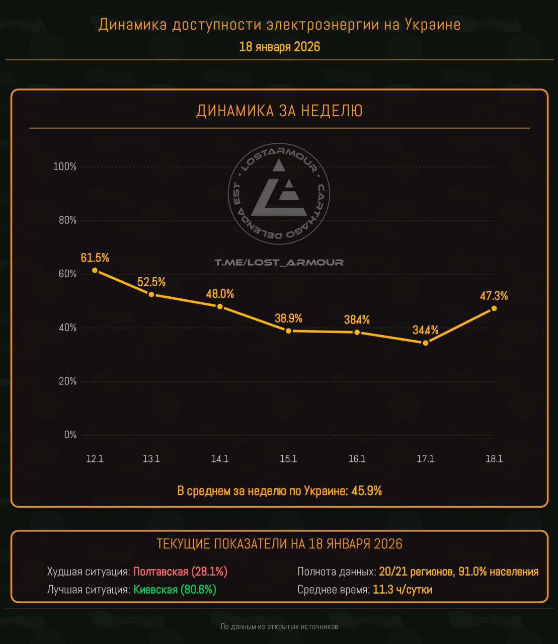 • Среднее время доступности электроэнергии за неделю - 11 часов (45,9%)