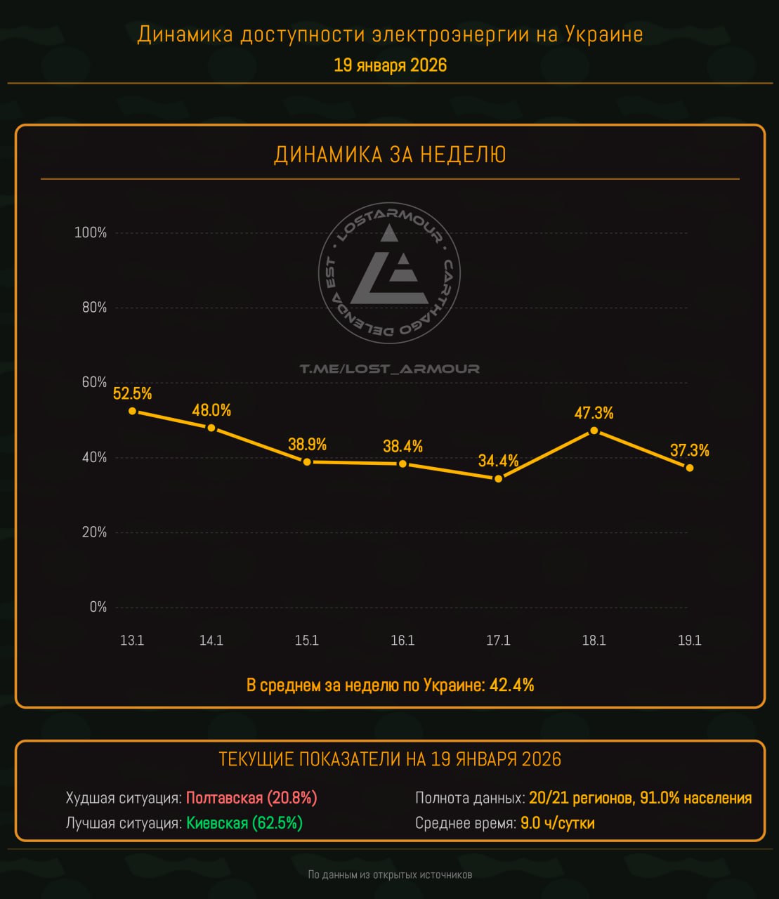 Инфографика доступности электроэнергии на территории Украины по областям на 19 января 2026.