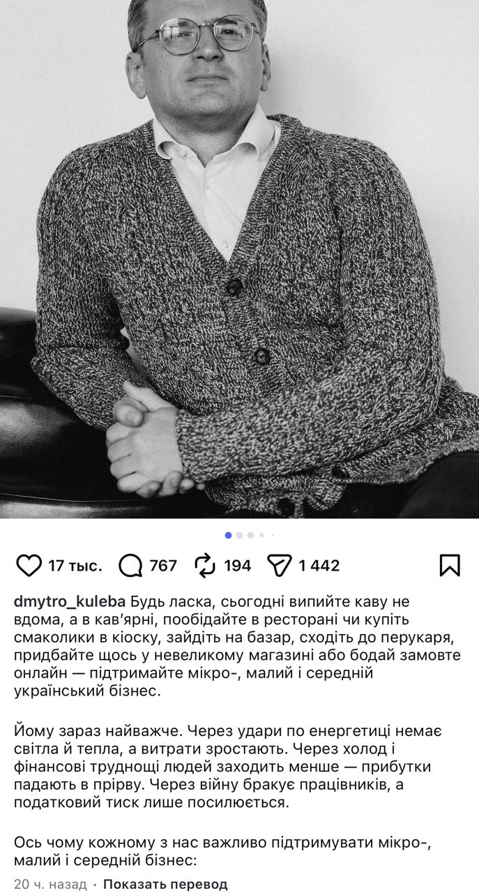 Обедать в ресторанах и пить "каву" не дома, чтобы поддержать малый бизнес, предложил украинцам экс-глава МИД Кулеба