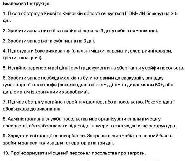 Всем иностранным посольствам поступило предупреждение о массированных обстрелах в ближайшее время, в связи с чем для них был объявлен последний уровень опасности – «красный»