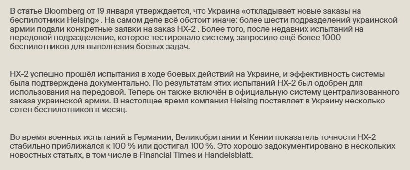 Хельсинг опровергает заявления Bloomberg про свои беспилотники.