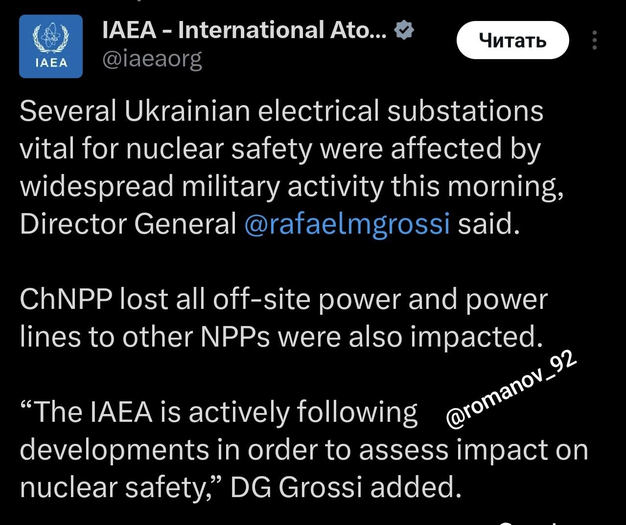 МАГАТЭ заявляет о том, что в результате ночного комбинированного удара ВС/ВКС России было прервано внешнее энергоснабжение Чернобыльской АЭС и повреждены линии электропередач, соединяющие другие Украинские АЭС: