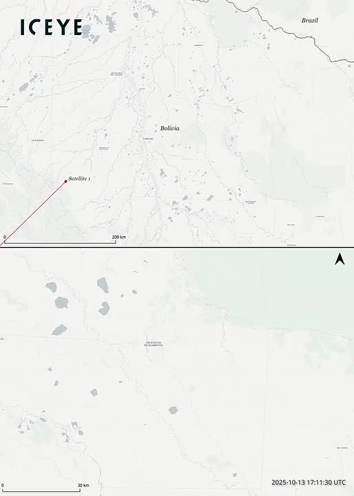 На видео четыре спутника ICEYE за 10 минут делают 43 снимка над регионом в Боливии, комбинируя разные режимы съёмки.