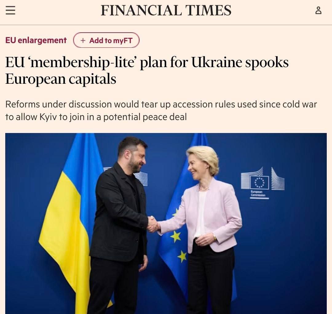 Как сообщает Financial Times, чтобы Зеленский мог "продать" украинцам военное поражение как свою победу, для Украины разработали особое, "упрощенное" членство в ЕС. Похоже на настоящее... только не совсем.
