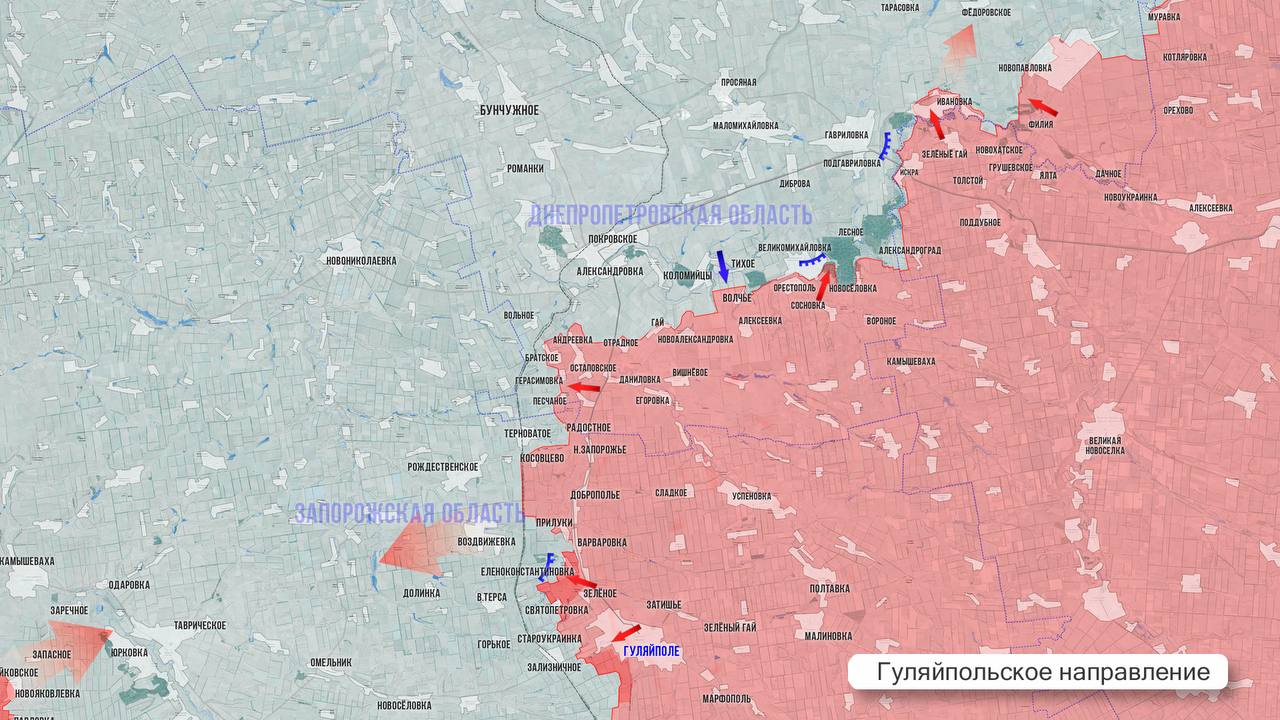 На Гуляйпольском участке ВС РФ за сутки взяли под контроль территорию в 7 км за р. Гайчур, расширив зону контроля между Дорожнянкой и Гуляйполем. На севере участка наши наступают в Новопавловке.