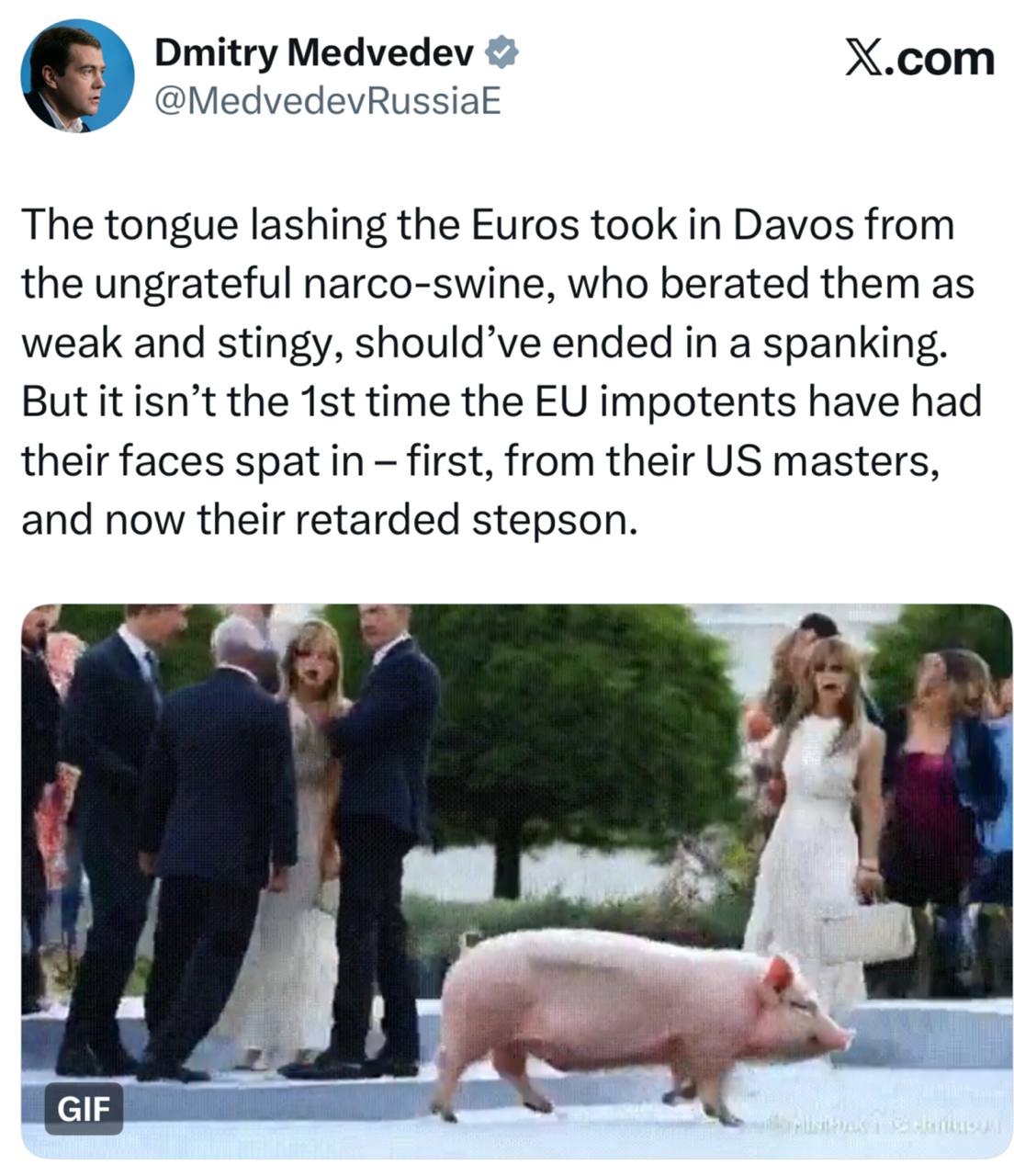Выговор неблагодарной наркосвиньи в Давосе, назвавшей европейцев слабыми и скупыми, должна была закончиться поркой. Но нет, европейским импотентам не впервой получать плевки прямо в лицо. Раньше от американских хозяев, а теперь и от своего пасынка-олигофрена.