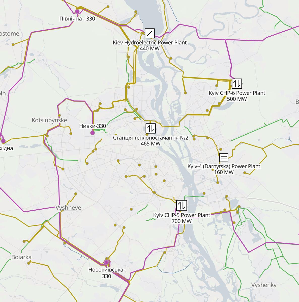 Частично Киев забирает электричество через ЛЭП по линии подстанций Северная - 330 - и Минская 110, которые, в свою очередь, тянутся от Ровенской АЭС. Есть и другая линия — она подключена от Хмельницкой АЭС через протяжённую ЛЭП, подстанцию Шепетовка (330/110/35/10 кВ) и Житомир к подстанции Новокиевская и ТЭЦ-5.