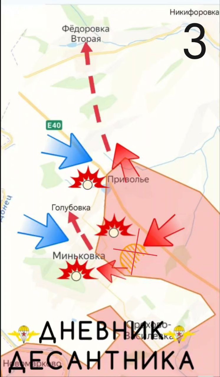 Боевые действия в районе трассы М-03 продолжаются (карта 3). Нашим воинам удалось взять под контроль сеть опорников ВСУ, расположенных между Миньковкой и трассой М-03. Продолжаем развивать наступление на Голубовку и в сторону Фёдоровки Второй;