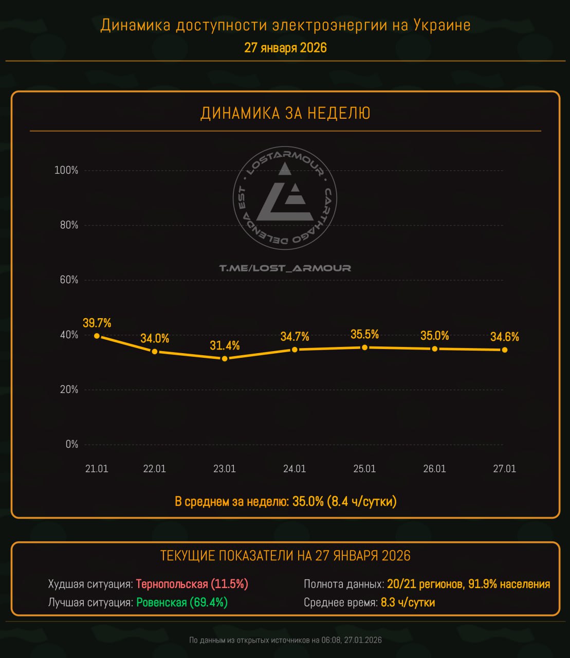 Инфографика доступности электроэнергии на территории Украины по областям на 27 января 2026.