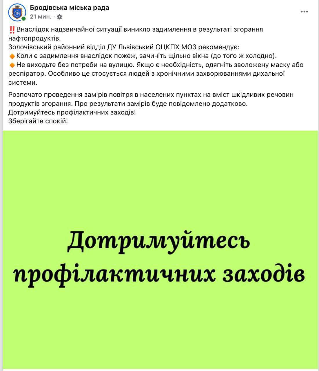 В Бродах Львовской области после атаки ВС РФ горят нефтепродукты, сообщает местный горсовет