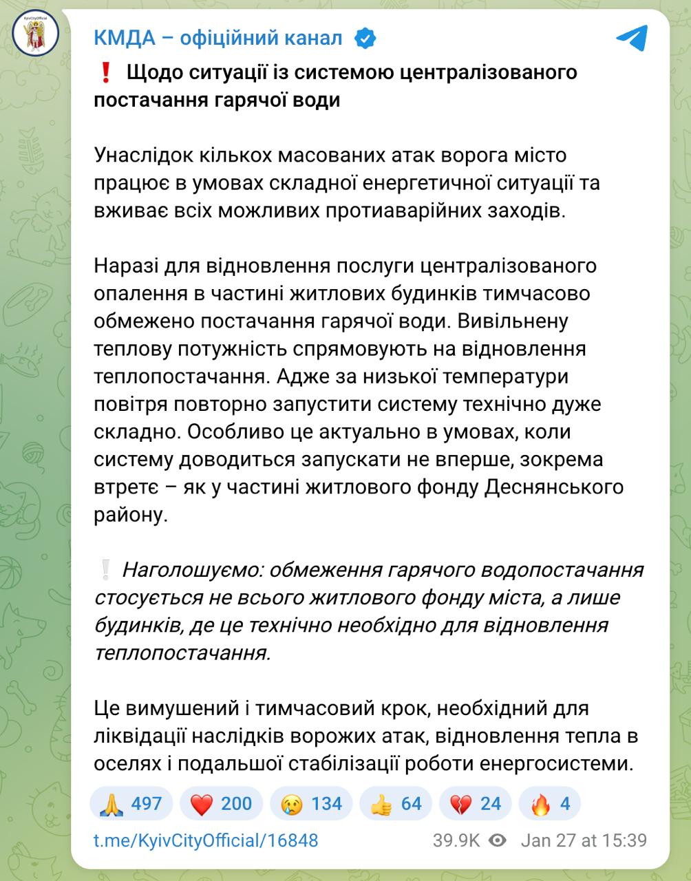 «Для восстановления услуги централизованного отопления в части жилых домов временно ограничены поставки горячей воды. Высвободившуюся тепловую мощность направляют на восстановление теплоснабжения. Ограничение горячего водоснабжения касается не всего жилищного фонда города, а только домов, где это технически необходимо для восстановления теплоснабжения», - сообщает мэрия.
