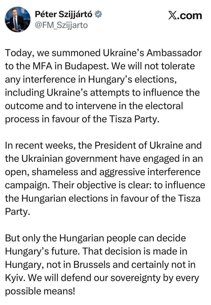 В последние недели президент Украины и украинское правительство развернули открытую, бесстыдную и агрессивную кампанию вмешательства. Их цель ясна: повлиять на венгерские выборы в пользу партии Тиса [оппозиционная партия].