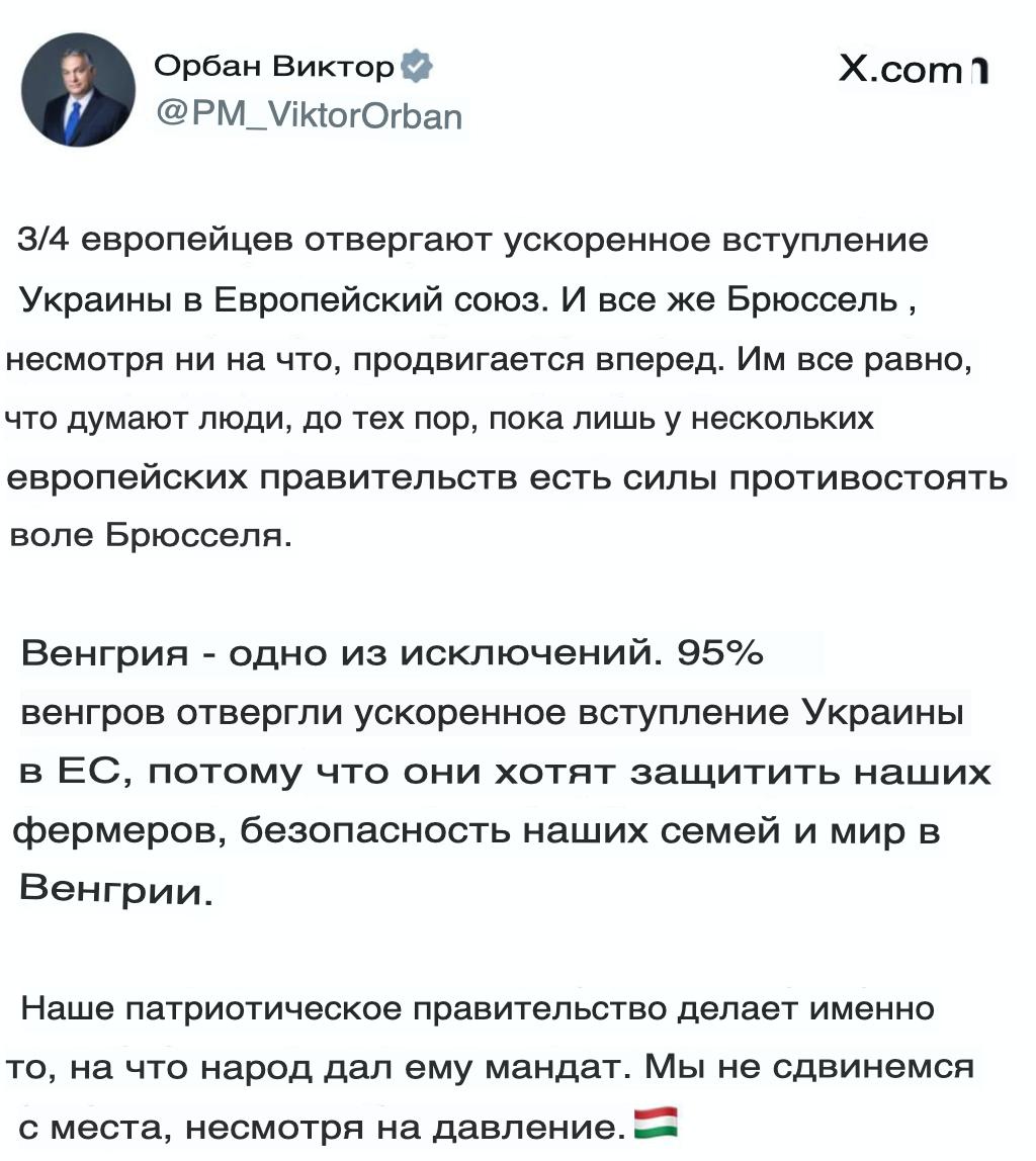 «3/4 европейцев отвергают ускоренное вступление Украины в Европейский союз», — премьер-министр Венгрии Виктор Орбан.