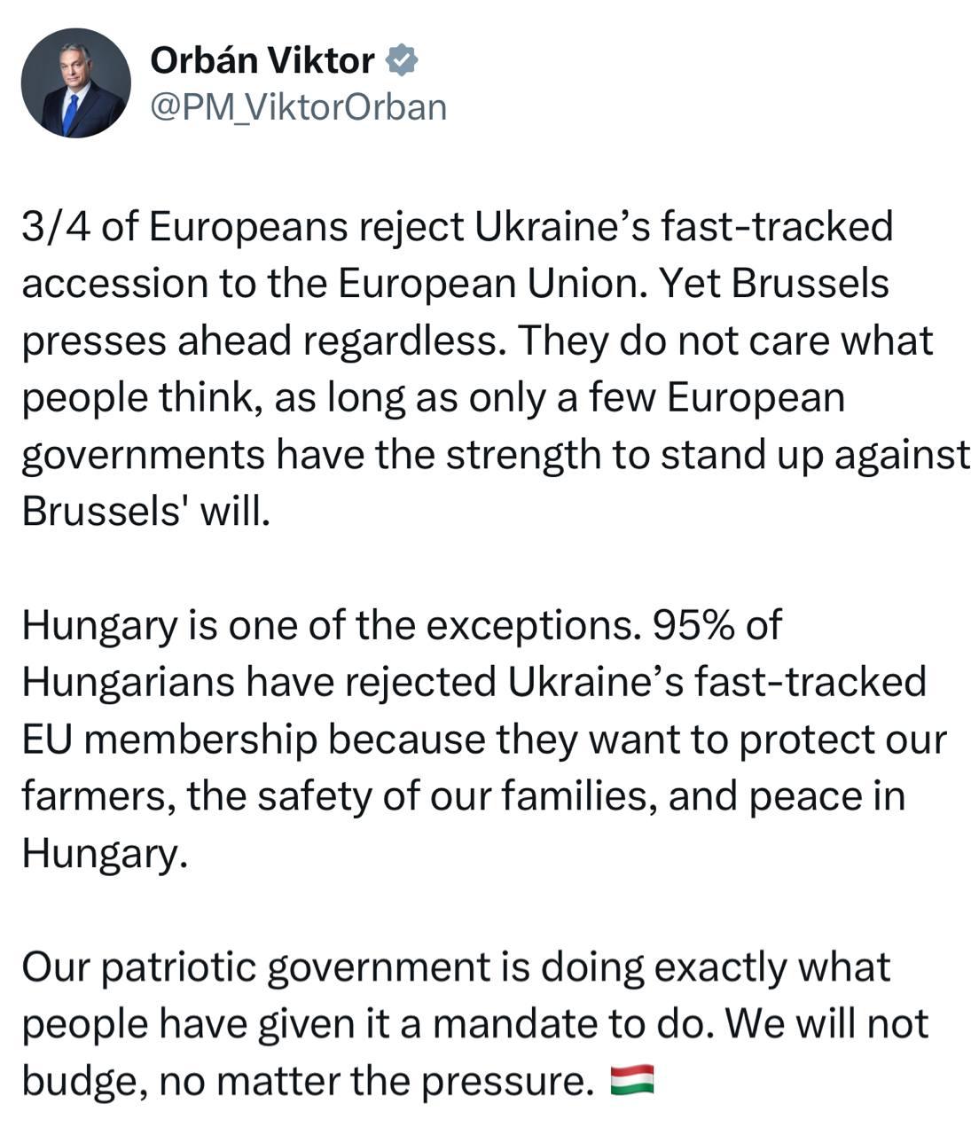 Орбан: Три четверти европейцев отвергают ускоренное вступление Украины в Европейский союз. Тем не менее, Брюссель продолжает двигаться вперед, несмотря ни на что. Им все равно, что думают люди, пока лишь немногие европейские правительства обладают достаточной силой, чтобы противостоять воле Брюсселя.
