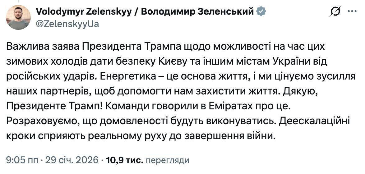 Зеленский благодарит Трампа за установленное энергетическое перемирие.