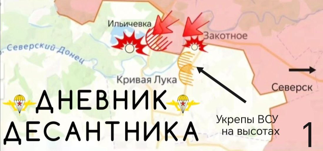 Закотное (карта 1). Здесь основной упор делаем на обход доминирующих высот, к югу от населённого пункта, избегая прямого давления на противника. Малыми группами просачиваемся в тылы позиций ВСУ, постепенно ослабляя оборону противника;Есть тактическое продвижение наших воинов юго-восточнее Ильичёвки (Озёрного), выходим к реке Северский Донец;