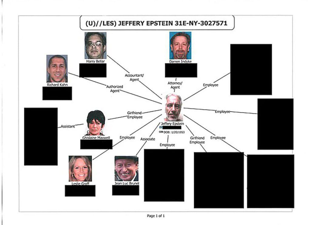 Cреди опубликованных файлов — схема связей Эпштейна с его предполагаемыми сообщниками, часть личностей скрыты. Среди фотографий — адвокат Эпштейна, его сообщница Гислейн Максвелл, финансовый советник, бухгалтер и помощник.