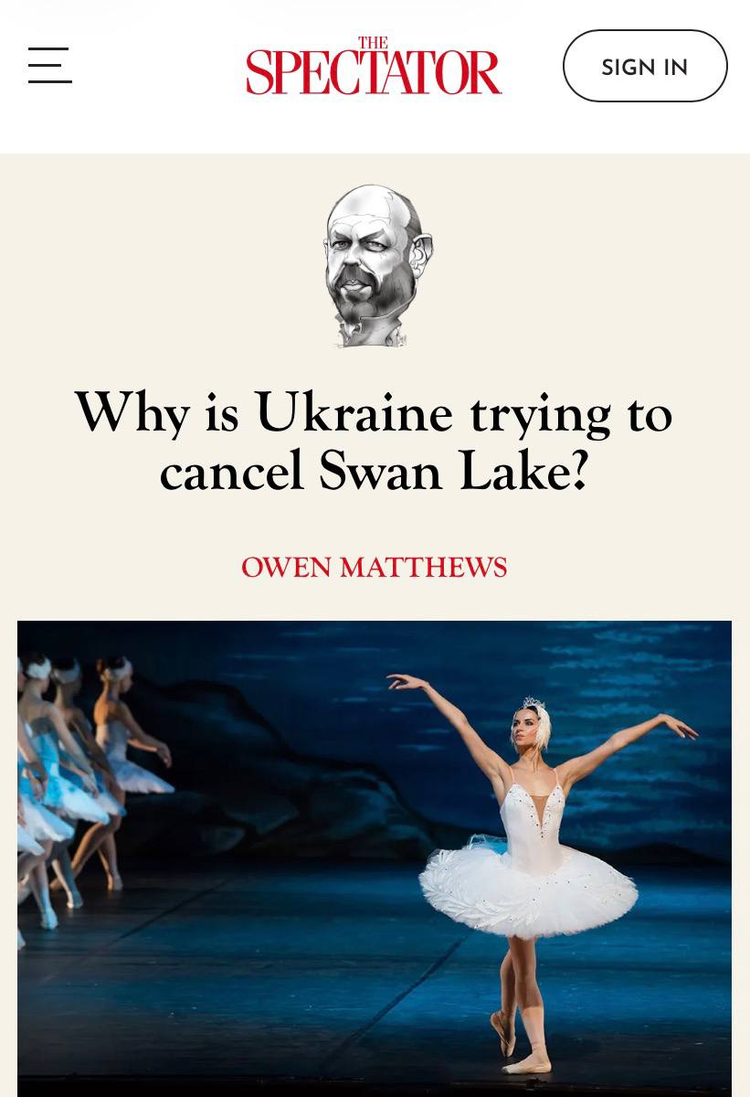 Автор статьи Оуэн Мэтьюс считает, что такой подход - зеркальное отражение путинизма - он отдает классическую русскую культуру Кремлю, вместо того чтобы отобрать её у режима. Чайковский и «Лебединое озеро» - часть мировой культуры, а не российской исключительности. Отмена всего русского только ослабляет Украину, усиливает нарратив Путина о «нерусскоязычных украинцах» и закрывает артистам двери для диалога с Европой через искусство»