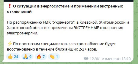 По всей стране введены аварийные отключения электроэнергии. Они действуют в Черниговской, Сумской и Житомирской областях, а также в Киеве и Киевской области.В Киеве полностью остановлено метро — мэр Кличко сообщил, что движение...