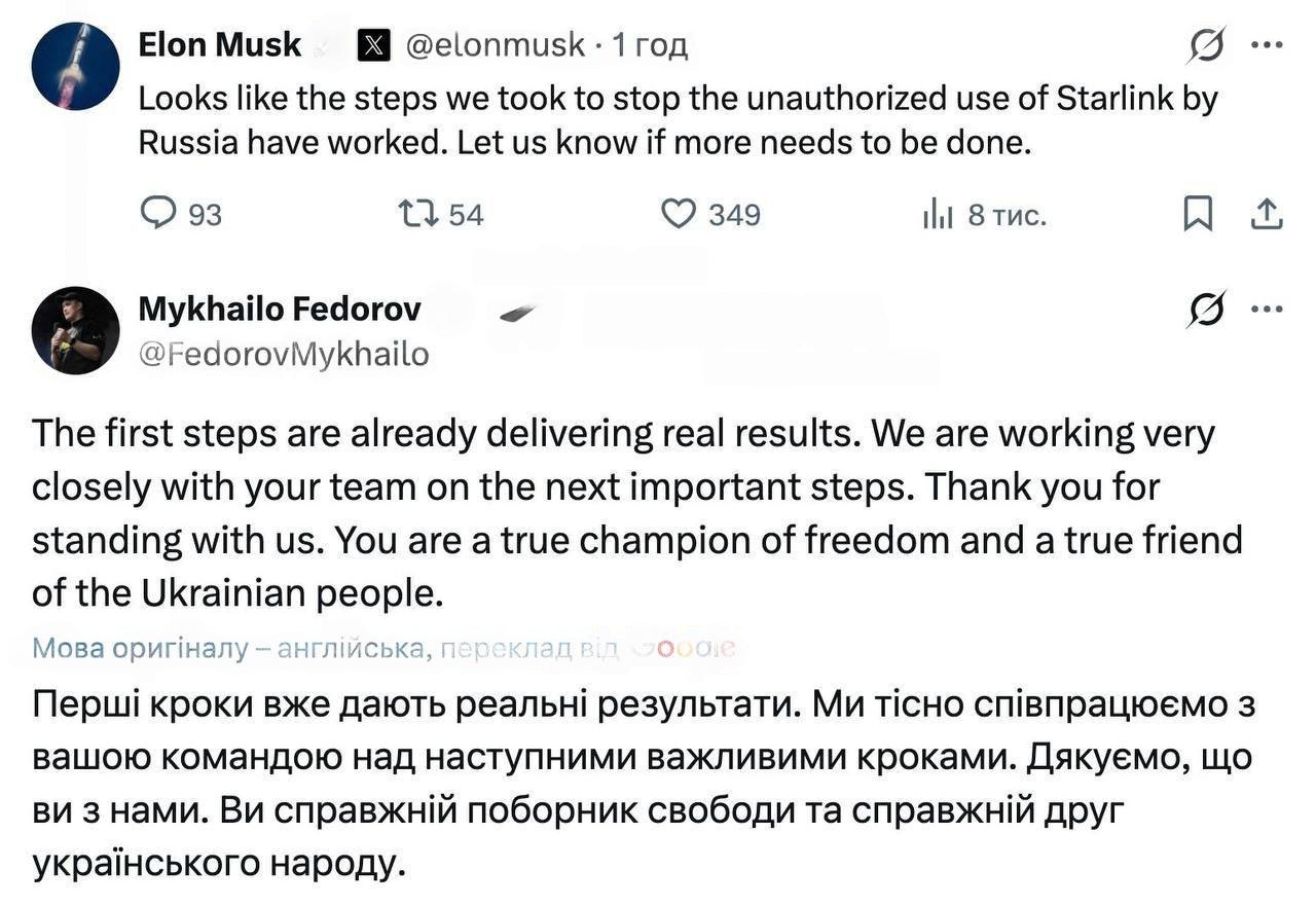 Министр обороны Федоров подтвердил, что первые шаги Маска по блокировке несанкционированного использования Starlink Россией «уже дают реальные результаты»