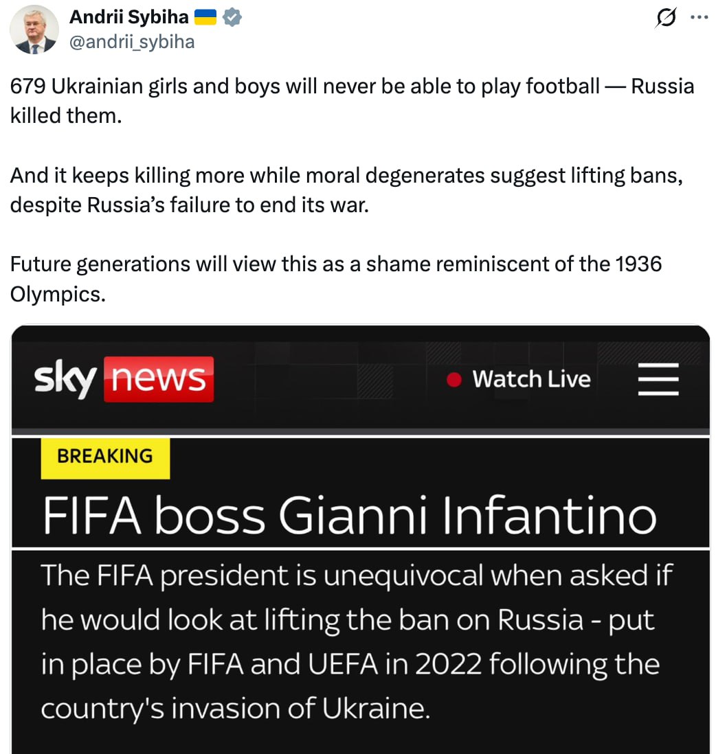 Быдловатый глава МИД Украины вышел на новый уровень хамства. Сибига назвал президента ФИФА Джанни Инфантино «моральным дегенератом» за его призыв отменить запрет на участие российских команд в международных турнирах.