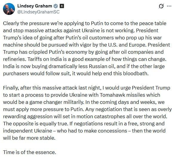 «Очевидно, что давление, которое мы оказываем на Путина, чтобы он сел за стол переговоров и прекратил массированные атаки Украины, не работает.Идея президента Трампа о преследовании нефтяных клиентов Путина, поддерживающих его военную машину, должна быть энергично реализована США и Европой. Наконец, после этой массированной атаки прошлой ночью, я бы призвал президента Трампа начать процесс поставки ракет «Томагавк» Украине, что стало бы переломным моментом в военном отношении.