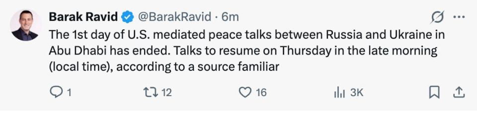 «Первый день мирных переговоров между Россией и Украиной при посредничестве США в Абу-Даби завершился. По словам источника, знакомого с ходом переговоров, их планируется возобновить в четверг поздним утром по местному времени».