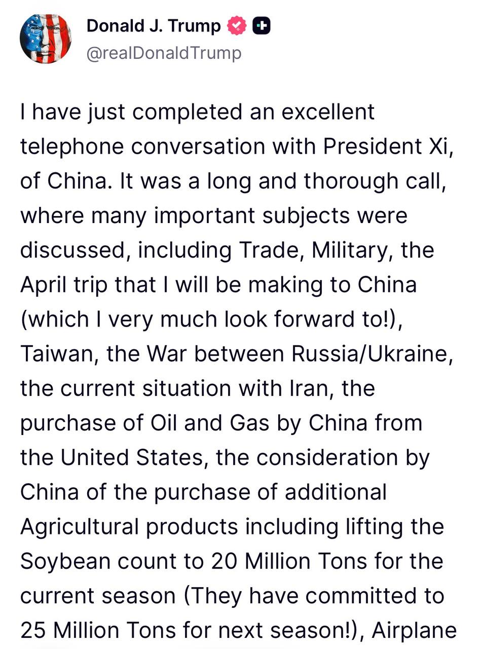 Я только что завершил отличный телефонный разговор с президентом Китая Си Цзиньпином. Это был долгий и обстоятельный разговор, в ходе которого обсуждались многие важные темы, включая торговлю, военное дело, мою апрельскую поездку в Китай (которую я с нетерпением жду!). Тайвань, войну между Россией и Украиной, текущую ситуацию с Ираном, закупку Китаем нефти и газа у США, рассмотрение Китаем вопроса о закупке дополнительных сельскохозяйственных продуктов, поставки авиационных двигателей и множество других тем, все очень позитивные!