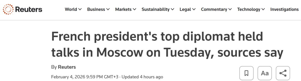 Reuters, со ссылкой на источники: во вторник главный дипломат президента Франции провел переговоры в Москве.