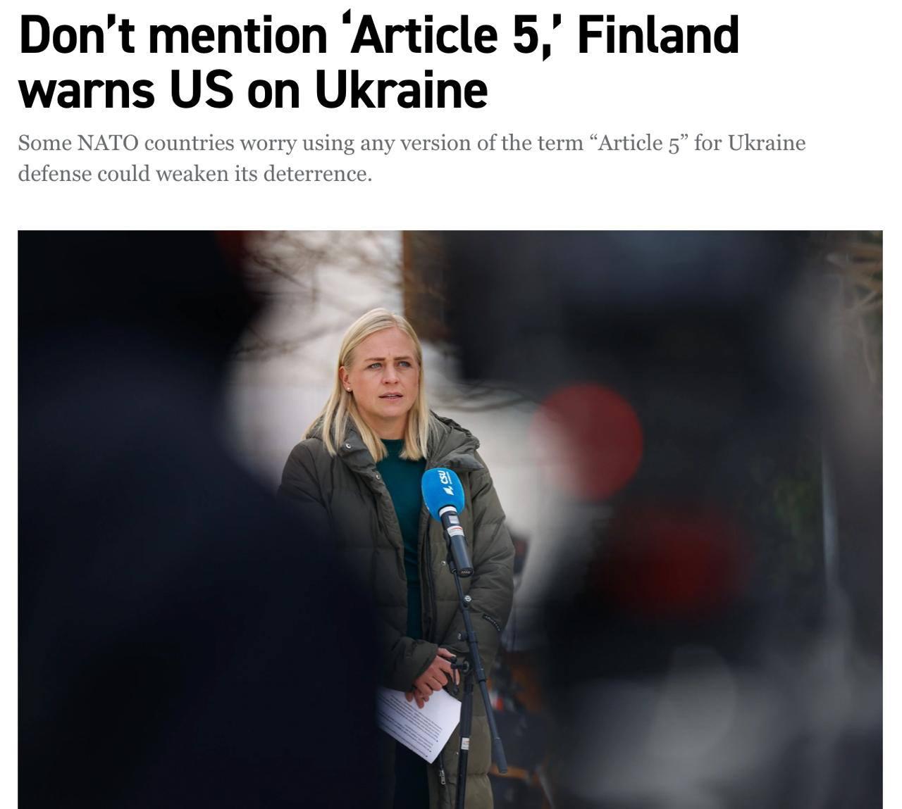 «[Министр иностранных дел Финляндии Элина Валтонен] предостерегла от любых предложений о "гарантиях, аналогичных статье 5" для послевоенной Украины», — сообщается в дипломатической телеграмме, с которой ознакомилось Politico. В документе подчёркивается, что между обязательствами НАТО и любыми будущими двусторонними договорённостями с Киевом должен существовать жёсткий «барьер».