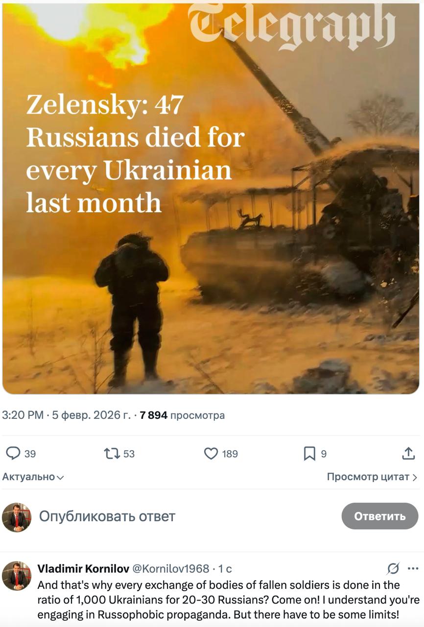 А Telegraph, как видите, не проверяя цифр Зеленского, не уточняя их, забыв о здравом смысле, выдает сегодня такие данные: на каждого погибшего украинца Россия якобы потеряла 47 своих бойцов.