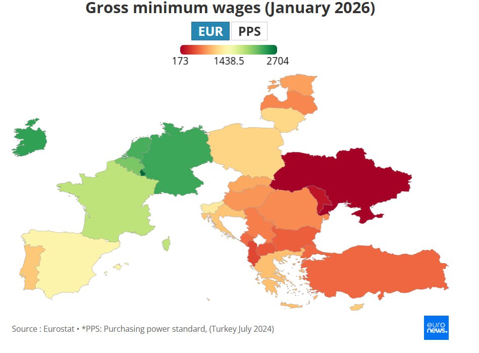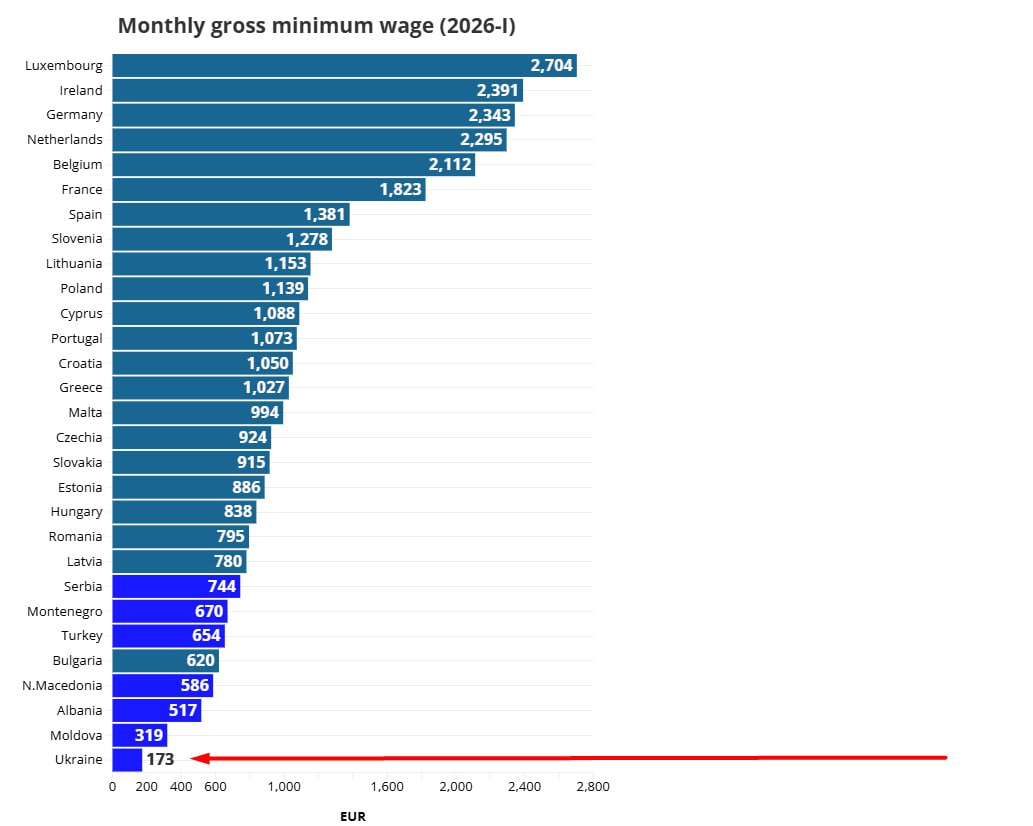 Согласно статистике европейских СМИ, минимальная зарплата на Украине — всего 173 евро. Это едва ли не в два раза меньше, чем в соседней (в том числе по списку) Молдавии — 319 евро.