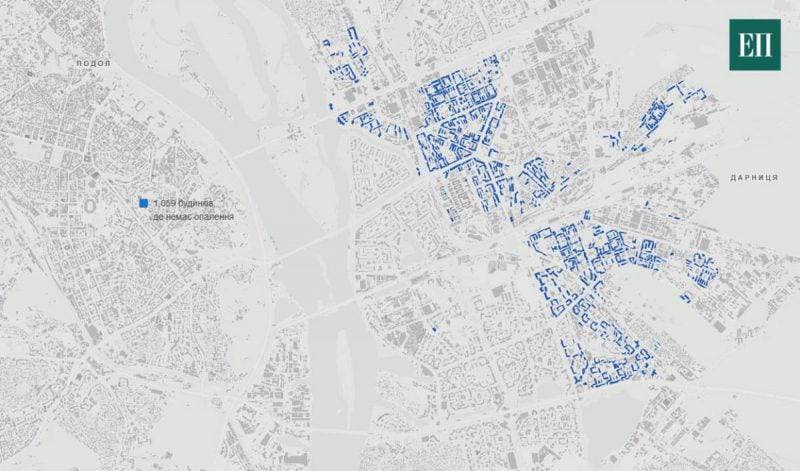 А вот карта домов в Киеве, которые гарантированно останутся без отопления до конца отопительного сезона.