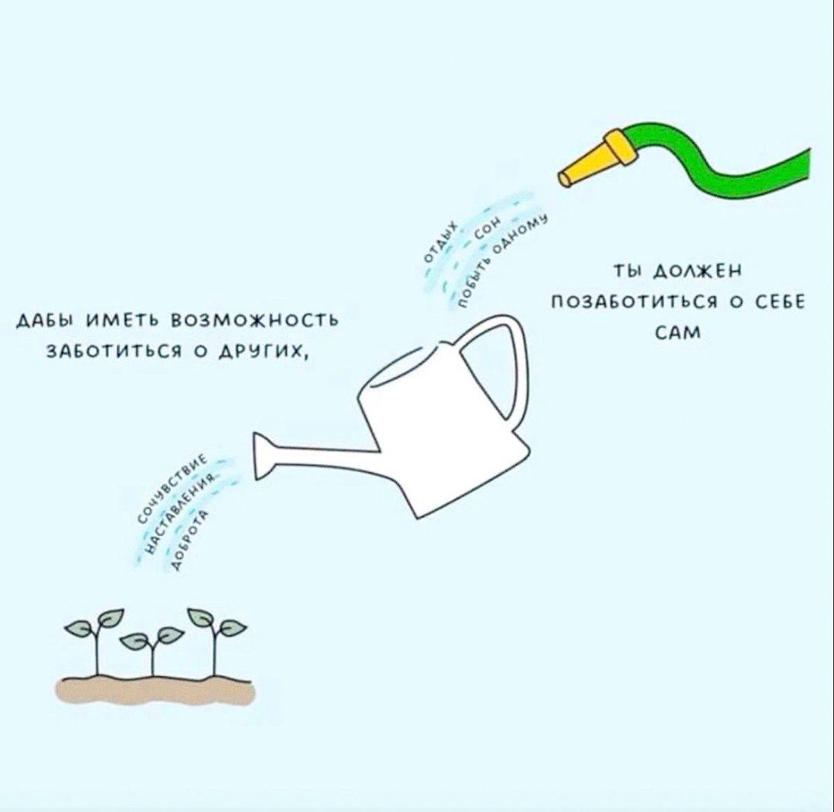 Картинка с лейкой — ровно об этом. Чтобы заботиться о других, нужно сначала наполнить себя. Отдохнуть. Выстроить фундамент. Перестать раздавать последние силы. Потому что иначе ты начинаешь жить чужими ожиданиями, чужими ролями, чужой гонкой. Так, незаметно, теряешь себя