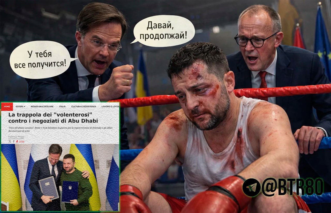 На этом фоне звучат милитаристские заявления Рютте о возможной интервенции Франции и Британии, а также обещания Туска накачать Киев снарядами и бронетехникой. Смысл один - дать Зеленскому понять, что боевые действия нужно продолжать любой ценой.