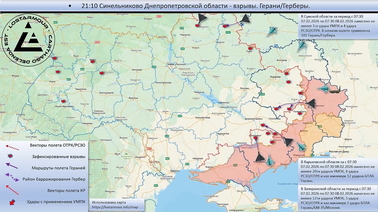 Анимированная схема ударов по территории Украины 07 февраля 2026 – 08 февраля 2026 года.