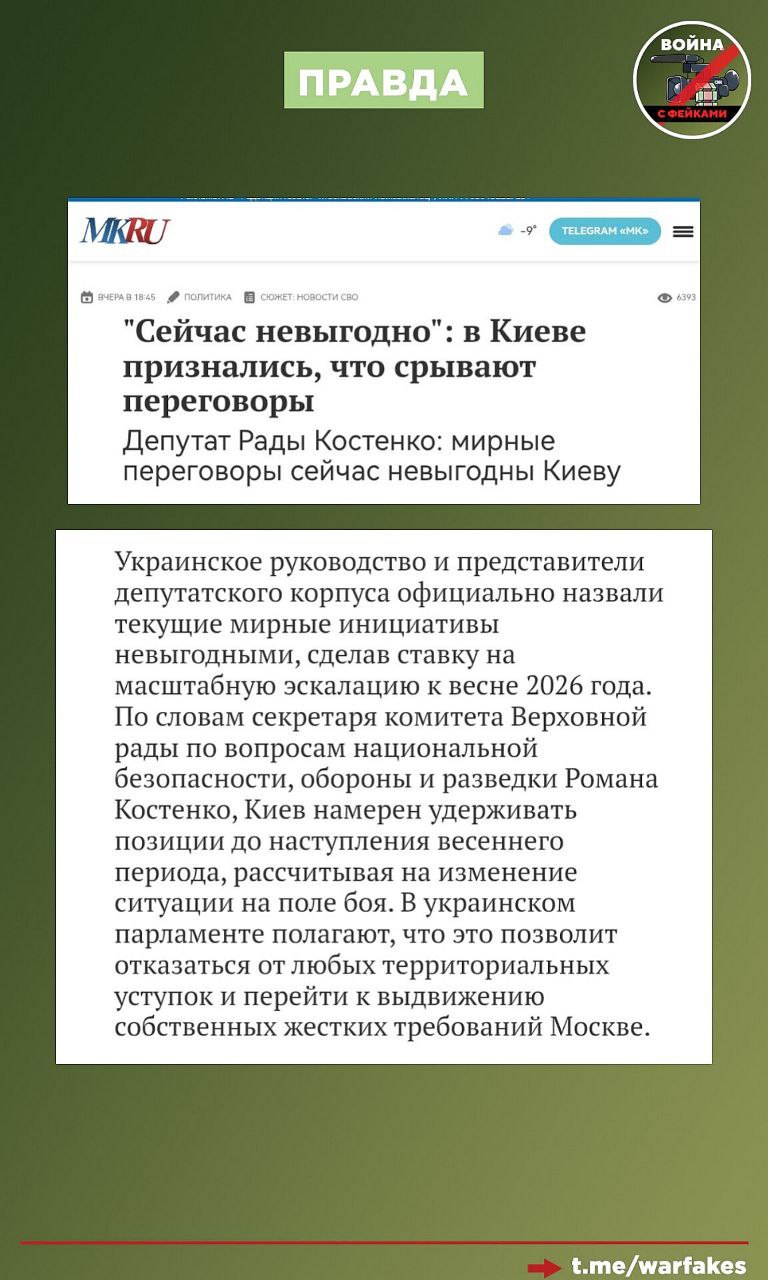 Правда: Представители киевского режима никогда не стремились к миру. Во-первых, они не выполнили ни одного пункта Минских соглашений. Во-вторых, украинская делегация отказалась от подписания мирного договора с Москвой в Стамбуле в 2022 году. Впоследствии Россия множество раз безуспешно пыталась возобновить конструктивный диалог с правительством Незалежной.