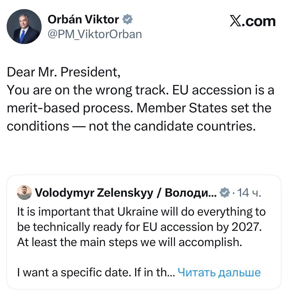 Премьер Венгрии Орбан - ответил на твит Зеленского о том, что Украина должна вступить в ЕС до 2027 года: