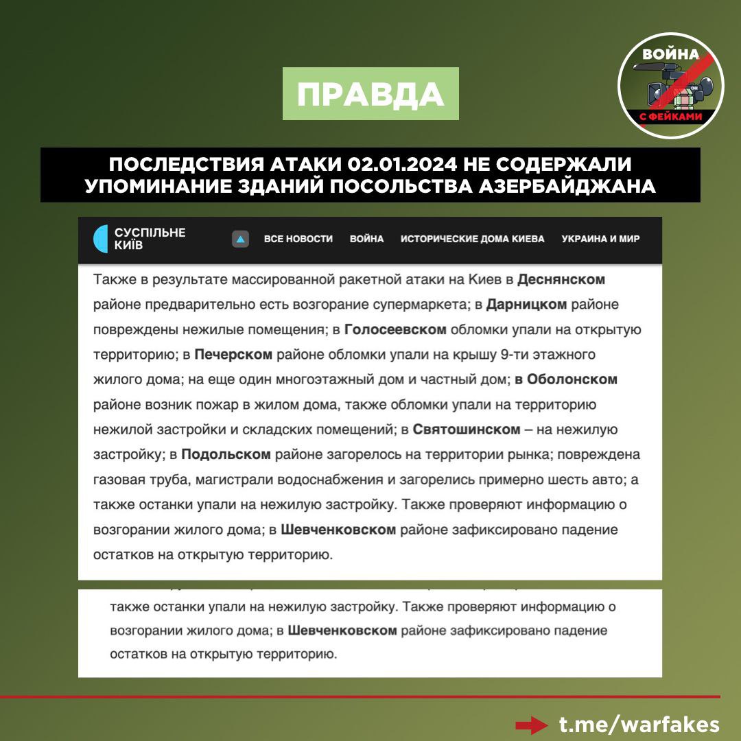 Фейк: Россия трижды прицельно обстреляла посольство Азербайджана в Киеве. Об этом заявил президент республики Ильхам Алиев.