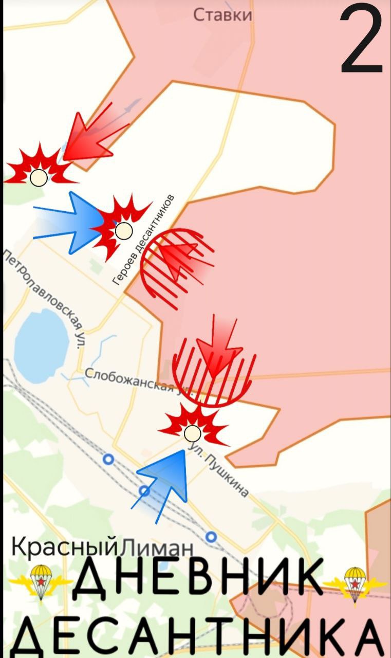 Красный Лиман (карта 2). В городской черте ВС РФ выбили противника из укрепа и расширили зону контроля в районе переулка Героев Десантников. Также есть продвижение в сторону улицы Советская (Слобожанская), улица Казацкая под нашим контролем;