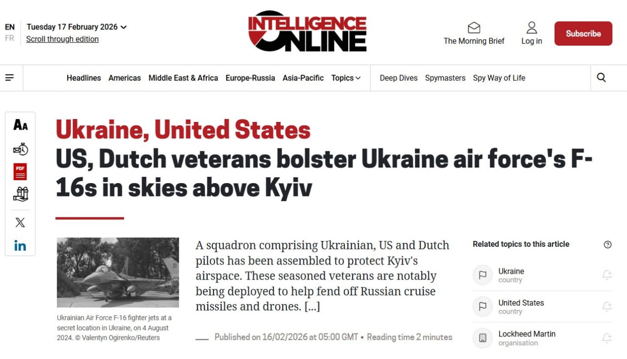 ‘Для защиты воздушного пространства Киева была сформирована эскадрилья из американских и голландских пилотов истребителей F-16. Эти опытные ветераны, в частности, будут помогать отражать атаки российских крылатых ракет и беспилотников’ — Intelligence Online.