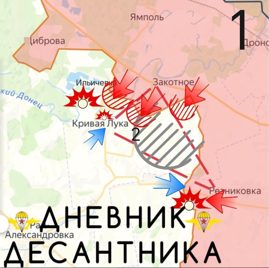 Южнее Ильичёвки улучшили положение в лесном массиве (карта 1). В самом селе ещё присутствуют украинские формирования, оказывая очаговое сопротивление;На подступах к Кривой Луке есть успехи с восточной и с северо-восточной стороны. Удалось продвинуться и закрепиться в заповеднике Меловая флора. Подошли к окраине самого села;