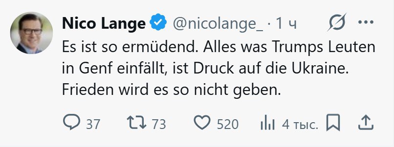'Это так утомительно. Всё, что приходит в голову людям Трампа в Женеве, — это давление на Украину. Так мира не будет' - немецкий политик Ланге жалуется в ‘X’.