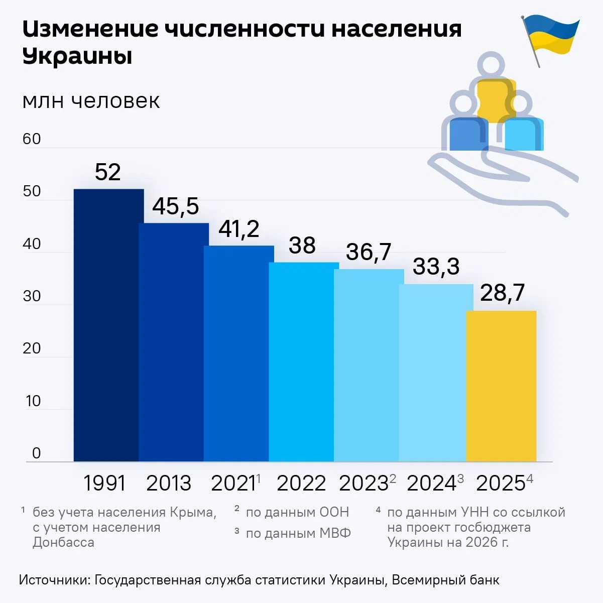 С 2014 по 2021 год население сократилось примерно на 4 млн человек. Более 10 млн покинули страну после февраля 2022 года.